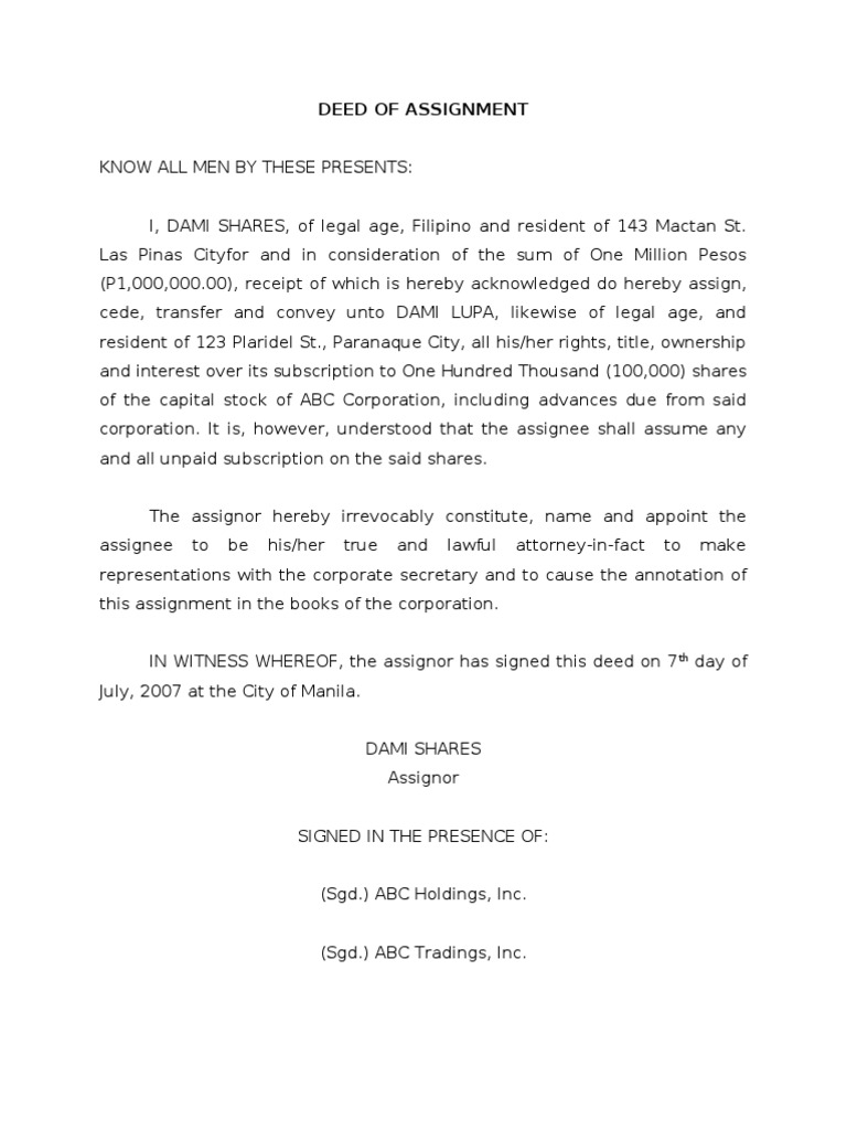 (DOC) DEED OF ASSIGNMENT OF SHARES | Car Gomz - Academia.edu from 0.academia-photos.com We will be touching on this important legal document in this article. Ask questions about your assignment. Search member by typing in the box below new assignment deed. The conveyance is done in. (the assignor) and aironet wireless communications, inc. Should the general meeting pass any changes or additions to the deed of assignment in the future, which for reasons of collective administration of. And it varies depending on your situation. A deed of assignment makes sure that you no longer have continuing obligations and rights as a signatory to that contract.